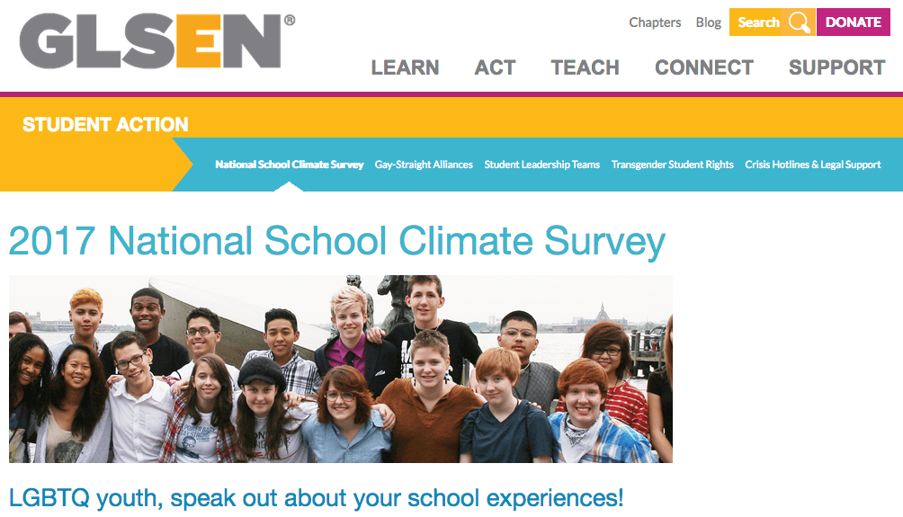 You can help GLSEN inform education policymakers and the public about what’s really going on in our nation’s schools by completing the 2017 National School Climate Survey.