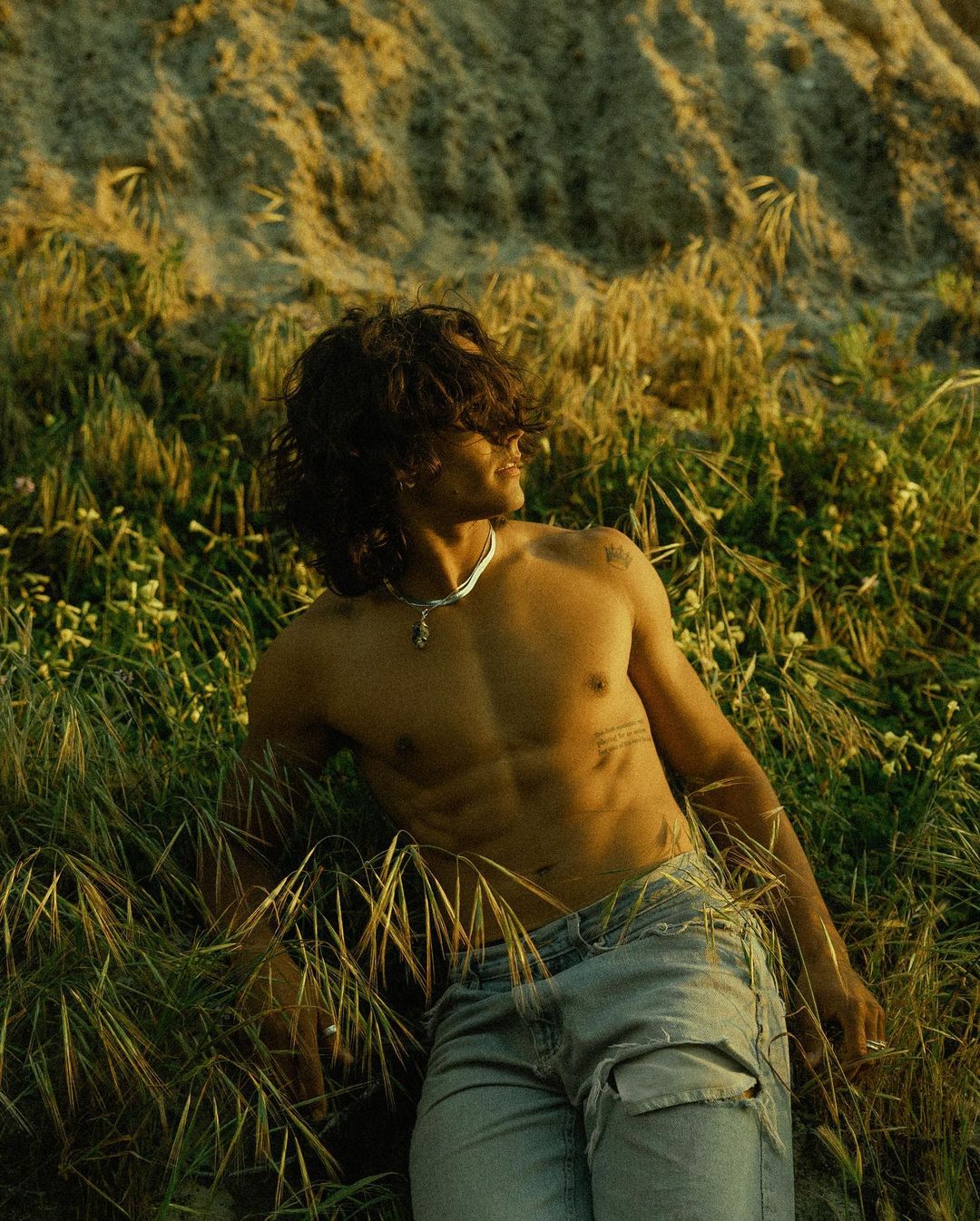 The stunning pics were taken in various nature backgrounds while the 23-year-old actor was shirtless and only wearing distressed denim jeans in some of the photos. He was wearing a tank top and/or a shirt over it in other photos, and his looks were accessorized with layered necklaces.