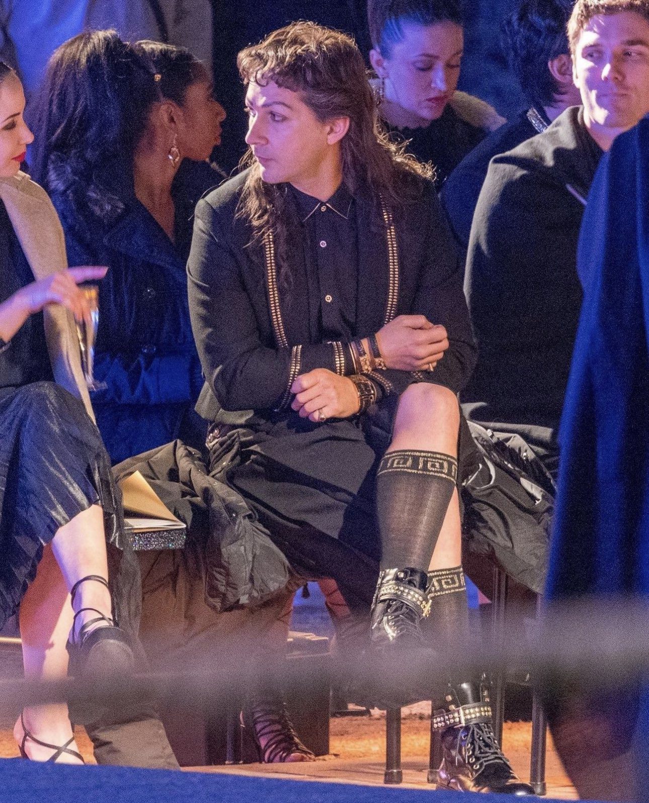 Like his Greek goddess transformation, the 36-year-old embattled actor was sporting a mullet for his upcoming film, ‘Megalopolis.’ He was wearing an all-black ensemble, paired with gold suspenders and sheer black stockings with Grecian prints.