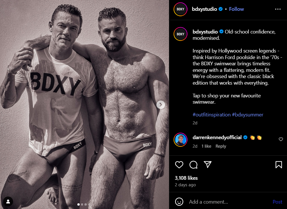 “Old-school confidence, modernised,” said an accompanying caption. “Inspired by Hollywood screen legends – think Harrison Ford poolside in the ‘70s – the BDXY swimwear brings timeless energy with a flattering, modern fit. We’re obsessed with the classic black edition that works with everything.”