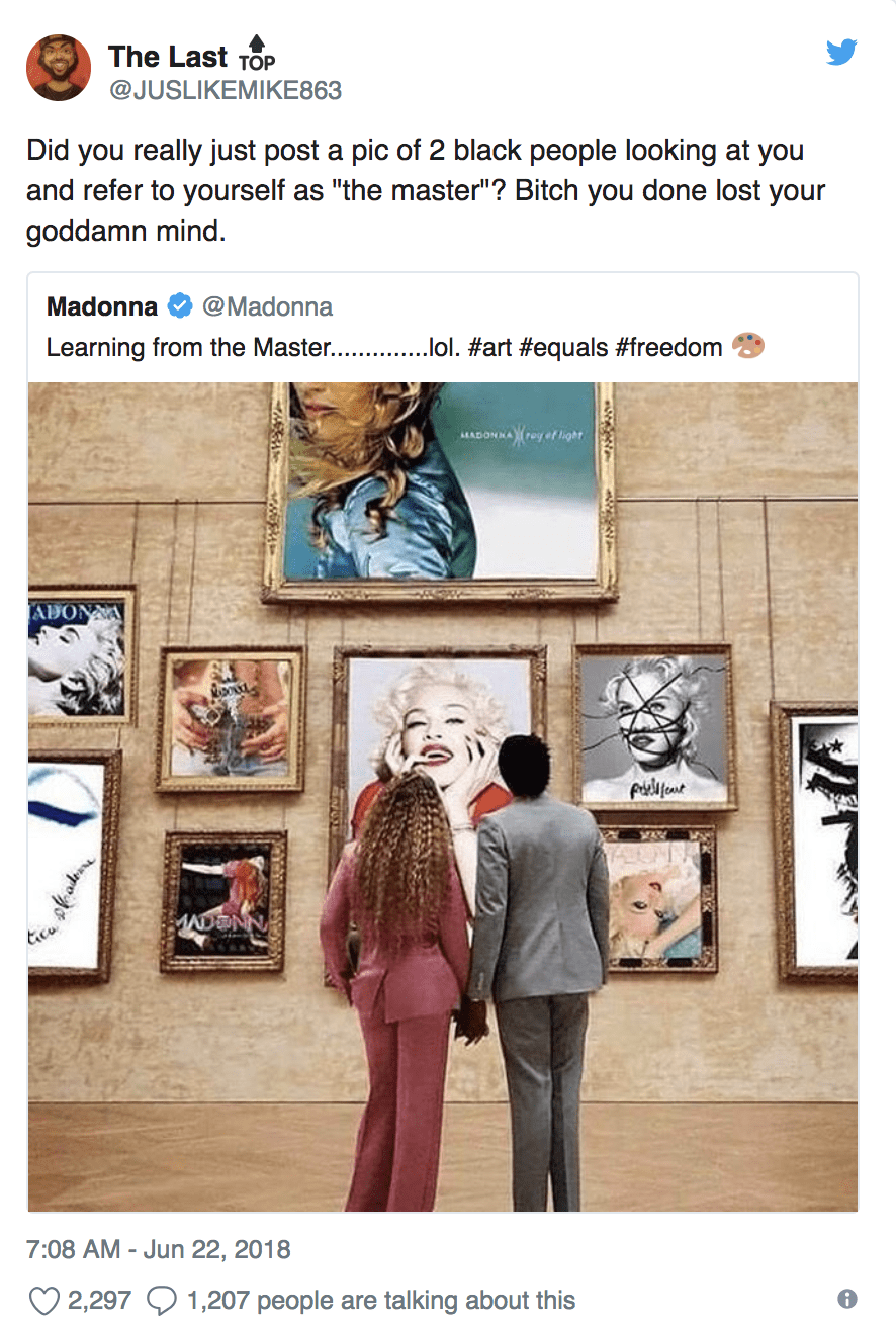Many Bey fans were outraged. It must be said, there’s some validity to criticizing Madge for posting a picture of two black entertainers looking at a white “Master.”
