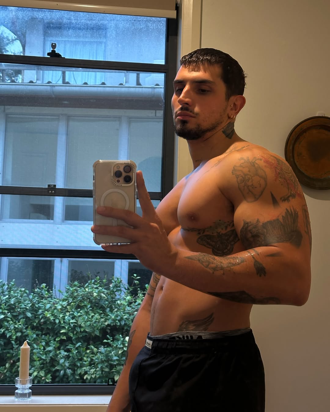 Of course, Kornisiuk isn’t just eye candy (though trust us, the candy is very sweet). His music career is taking flight just as quickly as his shirt comes off on Instagram. His latest tracks — Overstimulated, So Far, and Chills — have collectively racked up over 100K streams on Spotify. And if you’ve seen his socials (you have, don’t lie), you know he’s often caught shirtless and jamming out to his own tunes, radiating that cool, confident energy we’re all desperately trying to manifest this year.