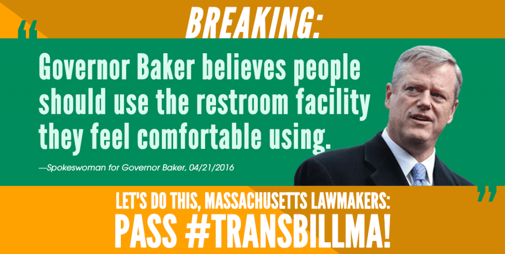 Today, Massachusetts Republican Governor Charlie Baker signed into law legislation extending commonsense, non-discrimination protections to transgender residents and visitors to the state. While Massachusetts state law already prohibits discrimination against transgender people in housing and employment, the new law extends these same crucial protections to public accommodations, such as access to restaurants, malls, restrooms, and locker rooms.