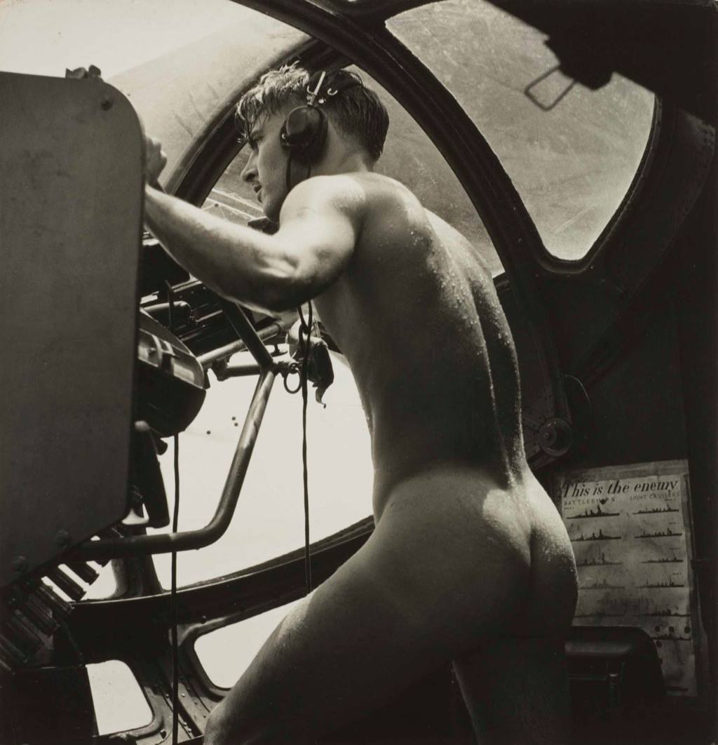 Since Japanese coastal defense guns were firing at the plane while it was in the water during take-off, this brave young man, after rescuing the pilot, manned his position as machine gunner without taking time to put on his clothes. A hero photographed right after he’d completed his heroic act. Naked.