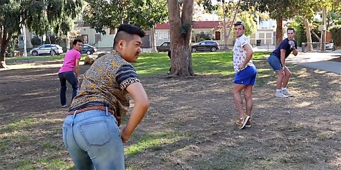 As Henry points out, “They’ve already found you – the gay bottom mafia!” Cut to a shot scanning the park with several gay men (“the hungry, hungry bottoms”) in beckoning positions.