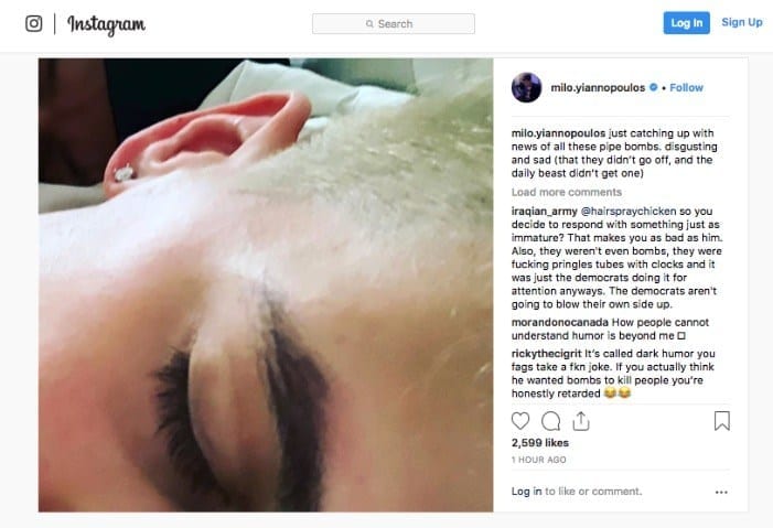 The Daily Beast stepped up the spotlight on the post with its article Instagram Refuses to Pull Down Milo Post Praising Mail Bombs. Apparently that was a big enough wattage and ….