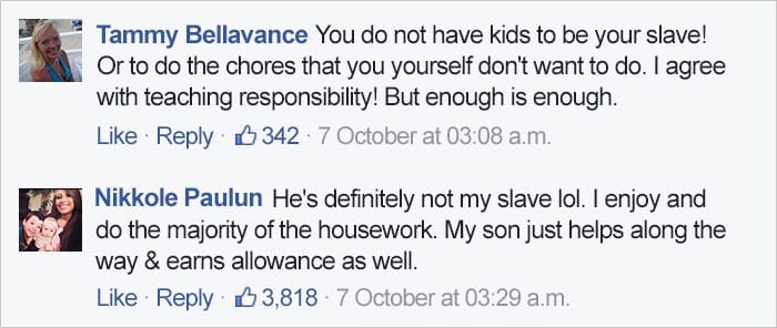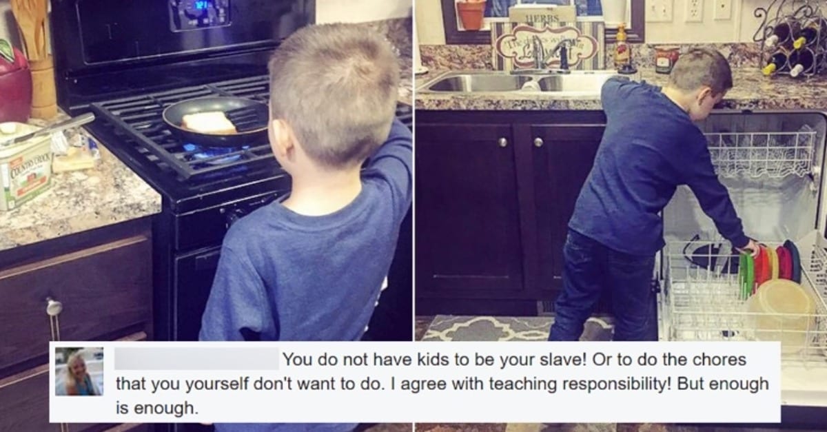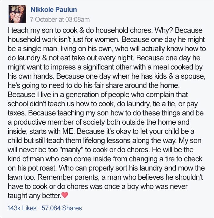 This is what mom-of-two Nikkole Paulun from Monroe, Michigan wrote on Facebook recently. The post was accompanied by pictures of her 6-year-old son Lyle doing the laundry, loading the dishwasher, and cooking on the stove. It’s since been liked more than 143k times and shared by over 57k people, but while Paulun has received a lot of praise for attempting to destroy heteronormative stereotypes, she’s also received criticism for treating her children like “slaves.” The 22-year-old mom, who once appeared on MTV reality show 16 and Pregnant, defended her statements, but opinions seem to be divided. What do you think? – boredpanda.com