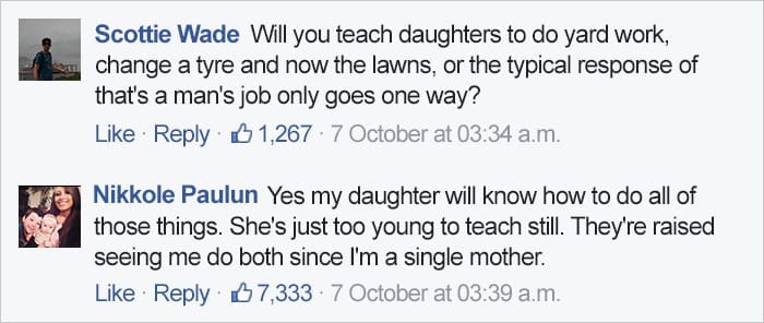 I am not embarrassed at all that I can cook quite well if I want to or sew and create just about anything but I can as well tune up a car, change brakes, operate any tool and machinery out there. There's nothing wrong with breaking the heteronormative molds when it comes to household chores and responsibilities, but Nikkole Paulun found out that there are some haters out there. Some feel boys should be boys, girls should be girls, and kids should be kids.