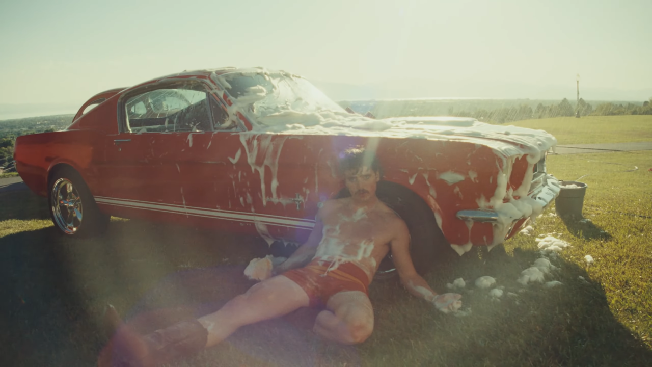 Sudsy, shirtless, and in red shorts so tight they could pass for a strong opinion, Boone absolutely commits to the bit. He tosses his hair like a Pantene prince, grinds on a muscle car like it’s his OnlyFans debut, and flashes the kind of wink that causes spontaneous heatwaves.