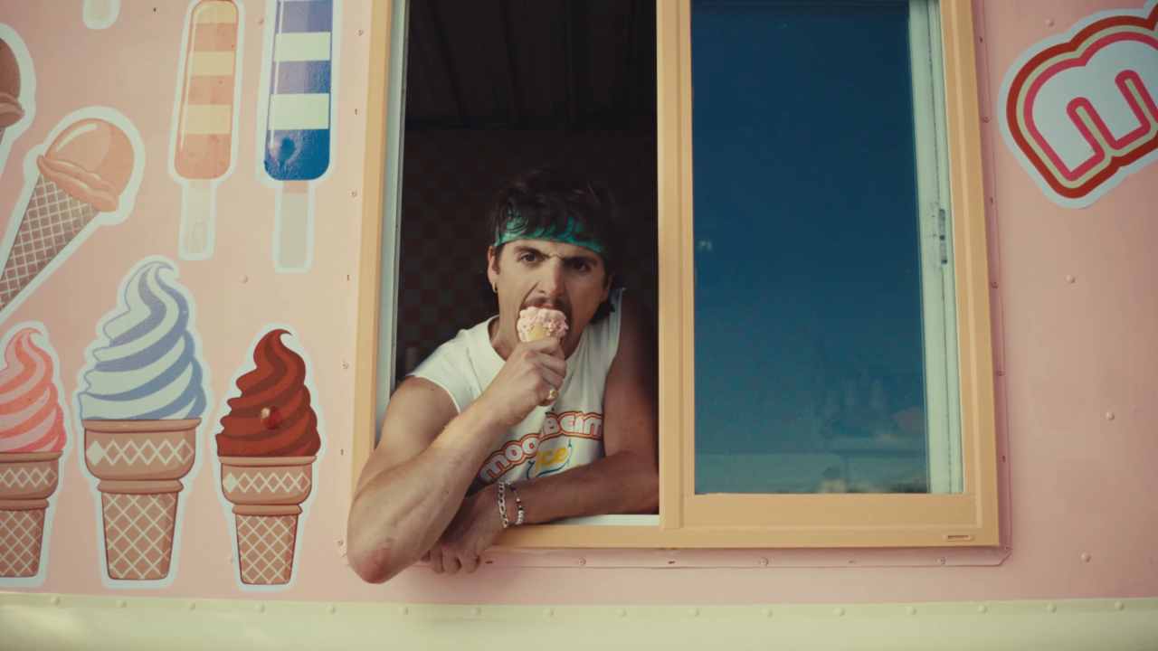 And while the visuals are pure eye candy, the jokes are just as sharp. A woman pulls up, he shoots his shot, and she speeds off. Her bumper sticker? “Mustaches are lame.” Brutal. Later, a little girl recognizes him at the ice cream truck: