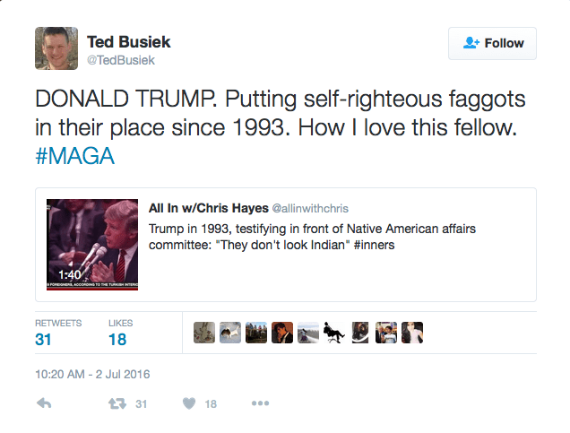 “Donald Trump. Putting self-righteous f****** in their place since 1993. How I love this fellow,” 30-year-old Ted Busiek of Littleton tweeted over the weekend.