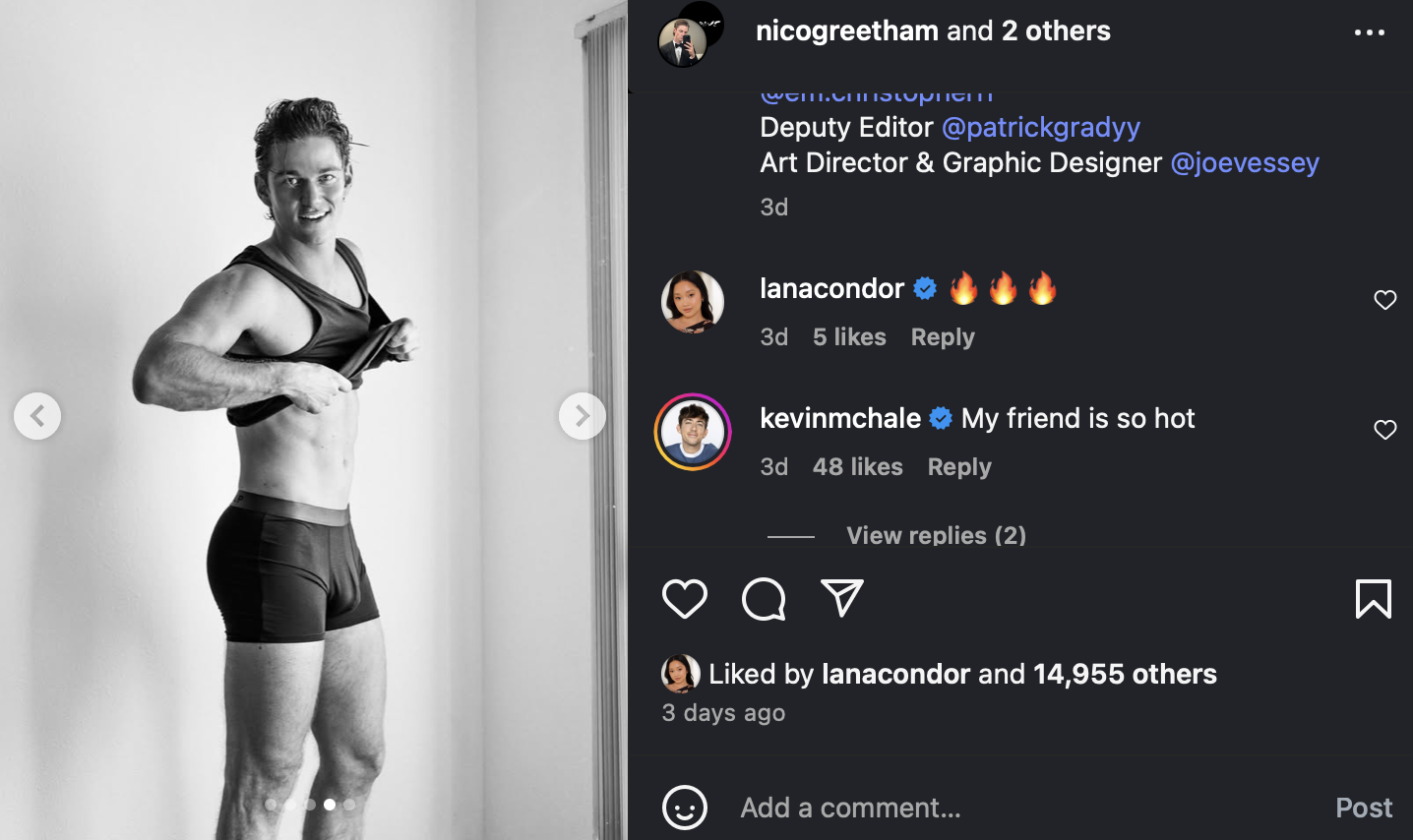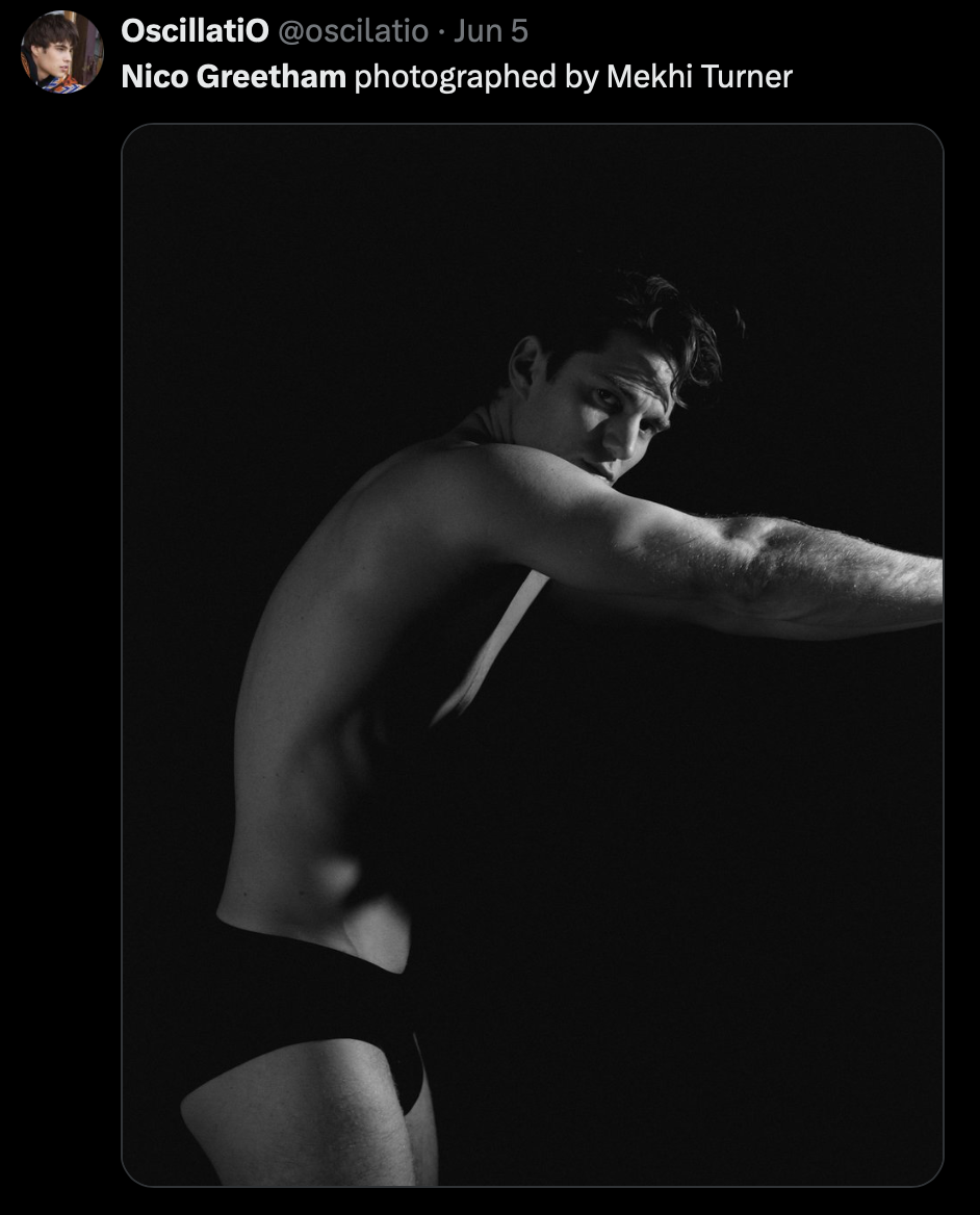 Another has him lying right side up, legs flexed like a Greek god, with his… let’s say assets front and center — ever so shyly corralled by a pair of very tight, very tiny boxer briefs. Nico, thank you for your service. The dogs have been let out, and the world is better for it.