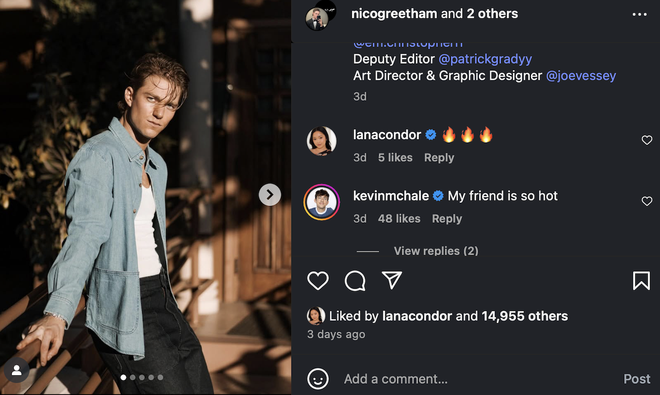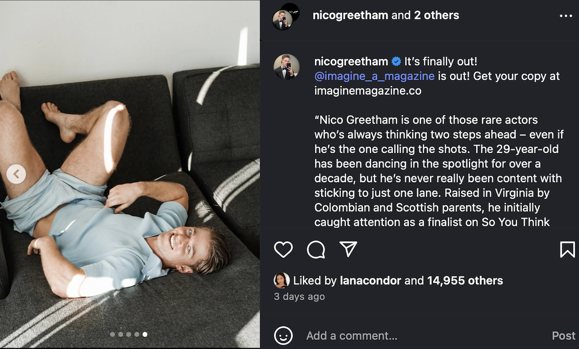 So if you’re looking for a good excuse to fan yourself dramatically while scrolling through high-res shots of a man who’s somehow both Adonis and golden retriever boyfriend rolled into one — Nico Greetham’s Imagine feature is the content you didn’t know your week needed.