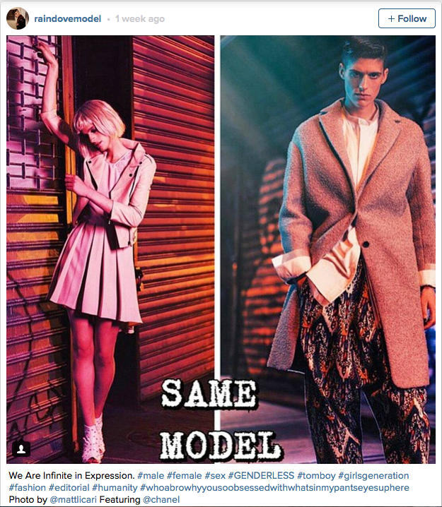 Androgynous models will also be out and about, like Rain Dove and Roan Louch. Both's gender bend seamlessly between men's and women's looks. Transgender "It girls" like the IMG signed model Hari Nef will also be walking the shows, said to have already been booked by the bigger design houses.