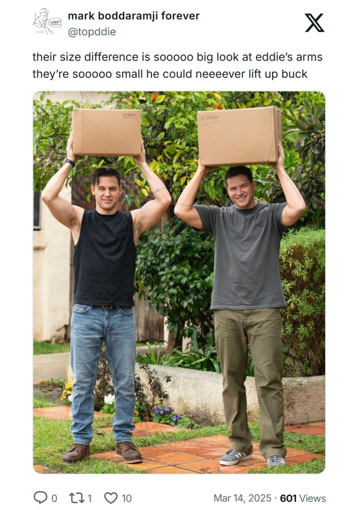 According to Guzman, the origin story goes back to season 2. “Eddie and Buck were walking down [the street], and we kept on bumping into each other’s shoulders,” he said. It wasn’t exactly an epic slow-motion, rain-drenched romance scene—it was just two guys walking awkwardly in the same direction. But that subtle physicality became the perfect kindling for a fire of fan speculation. Suddenly, a harmless, and honestly somewhat relatable, interaction between two characters turned into the tender, simmering “will-they-won’t-they” moment that every shipper dreams of.