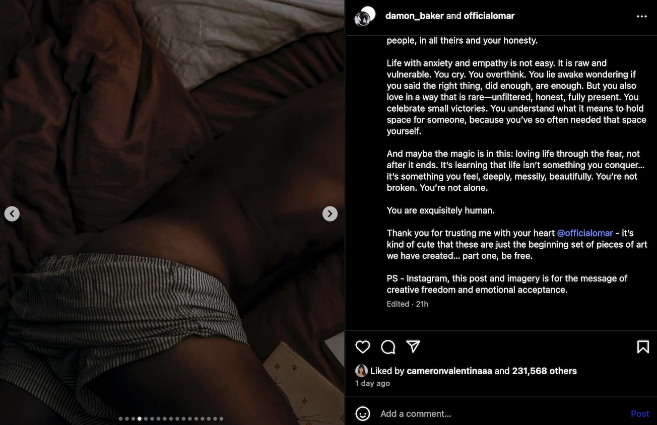 What sets this series apart is the emotional undercurrent woven throughout—especially in the caption Baker penned to accompany Omar’s images: