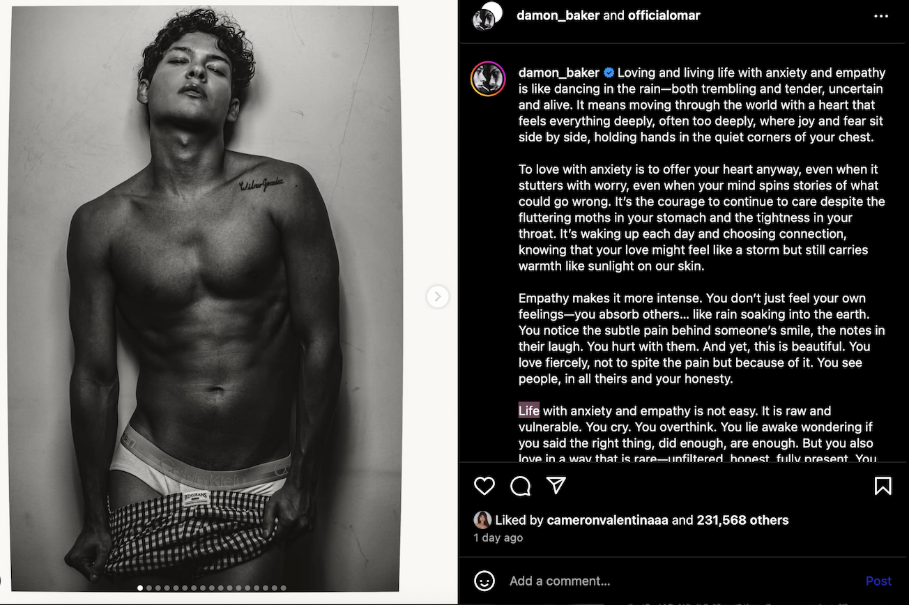 The 26-year-old Venezuelan-Swedish star, best known globally for his role as Simon in Young Royals, joins the ranks of Taylor Swift, Post Malone, Emma Roberts, and Damiano David as the latest muse in Baker’s free art series. But make no mistake: this isn’t just a hot photoshoot (though, yes, it is that too). It’s an emotional statement piece—one that pulses with vulnerability, empathy, and the gentle ache of being human.