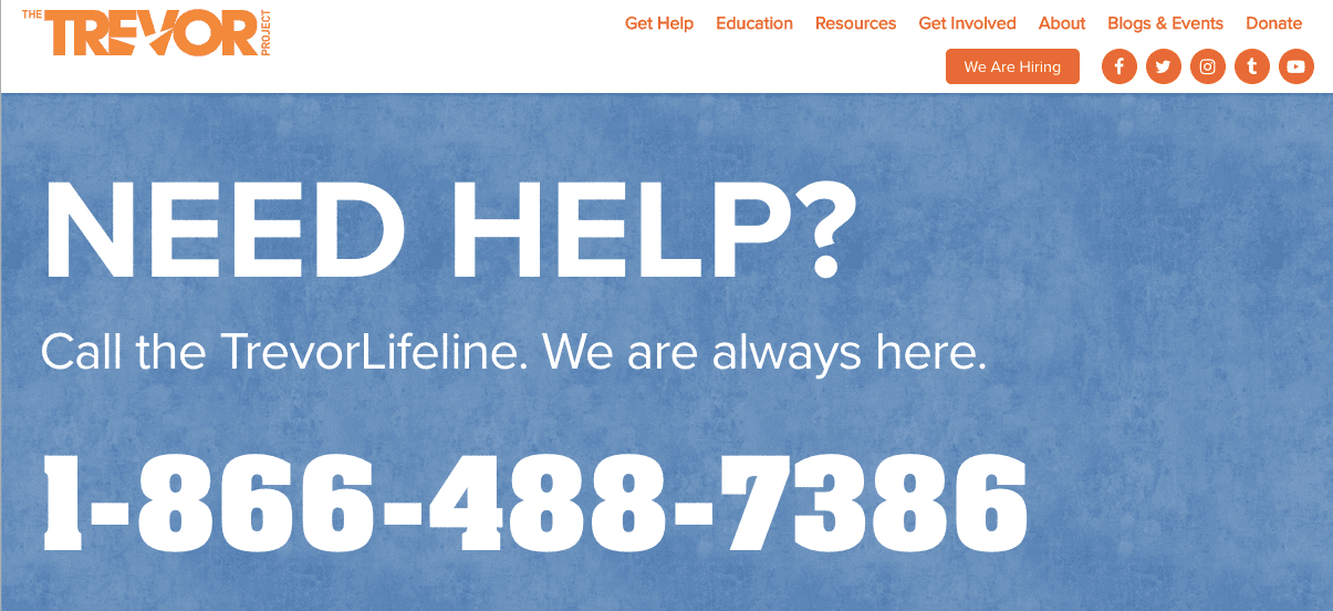 If you or anyone you know is in emotional distress or having suicidal thoughts, please call The Trevor Project 1-866-488-7386 (thetrevorproject.org) or the National Suicide Prevention Hotline at 1-800-273-8255 (suicidepreventionlifeline.org).