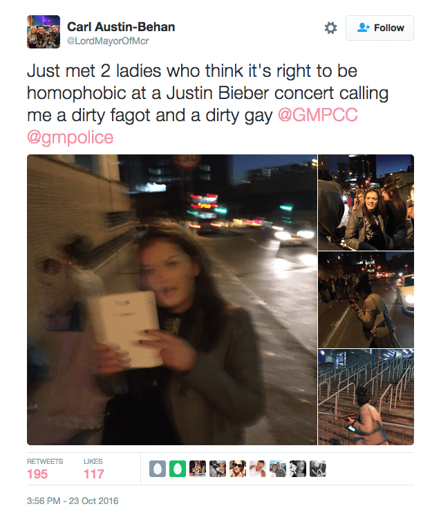 Carl Austin-Behan, Manchester’s first openly gay lord mayor, said he was called a “dirty faggot and a dirty gay” by two young women before the sold-out gig at Manchester Arena.