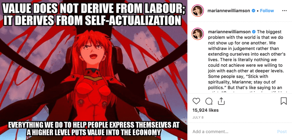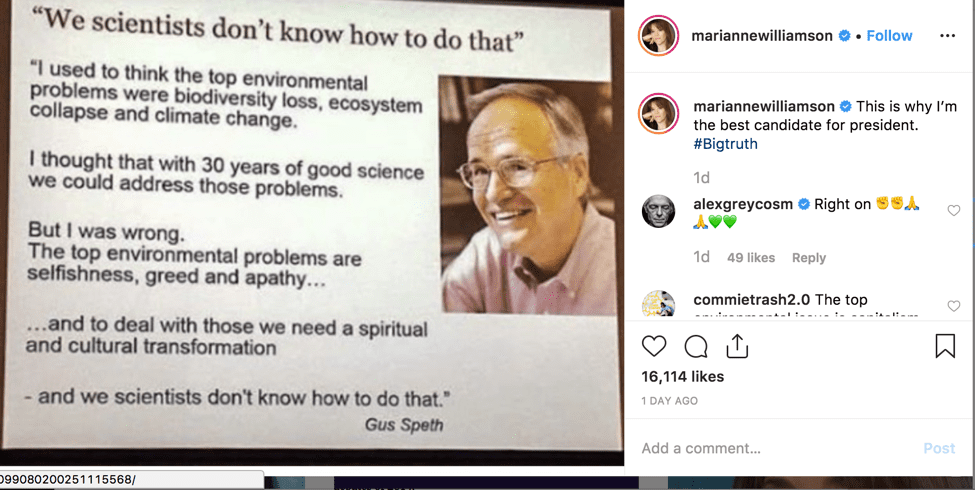 Plucking a number from nothing and condemning good faith efforts to investigate further what would be needed is the kind of distracting oversimplification and “truth-telling” at which Williamson excels. Cloaked in memes (yes, sometimes quite funny ones) and the “quirky-but-nice aunt at a family reunion” mystique she actively inculcates, Williamson’s insidiousness—her weakly walked-back stances on science and medicine above all—is hiding in plain sight. In our perpetual reality show-esque primary races, though, you wouldn’t know it.