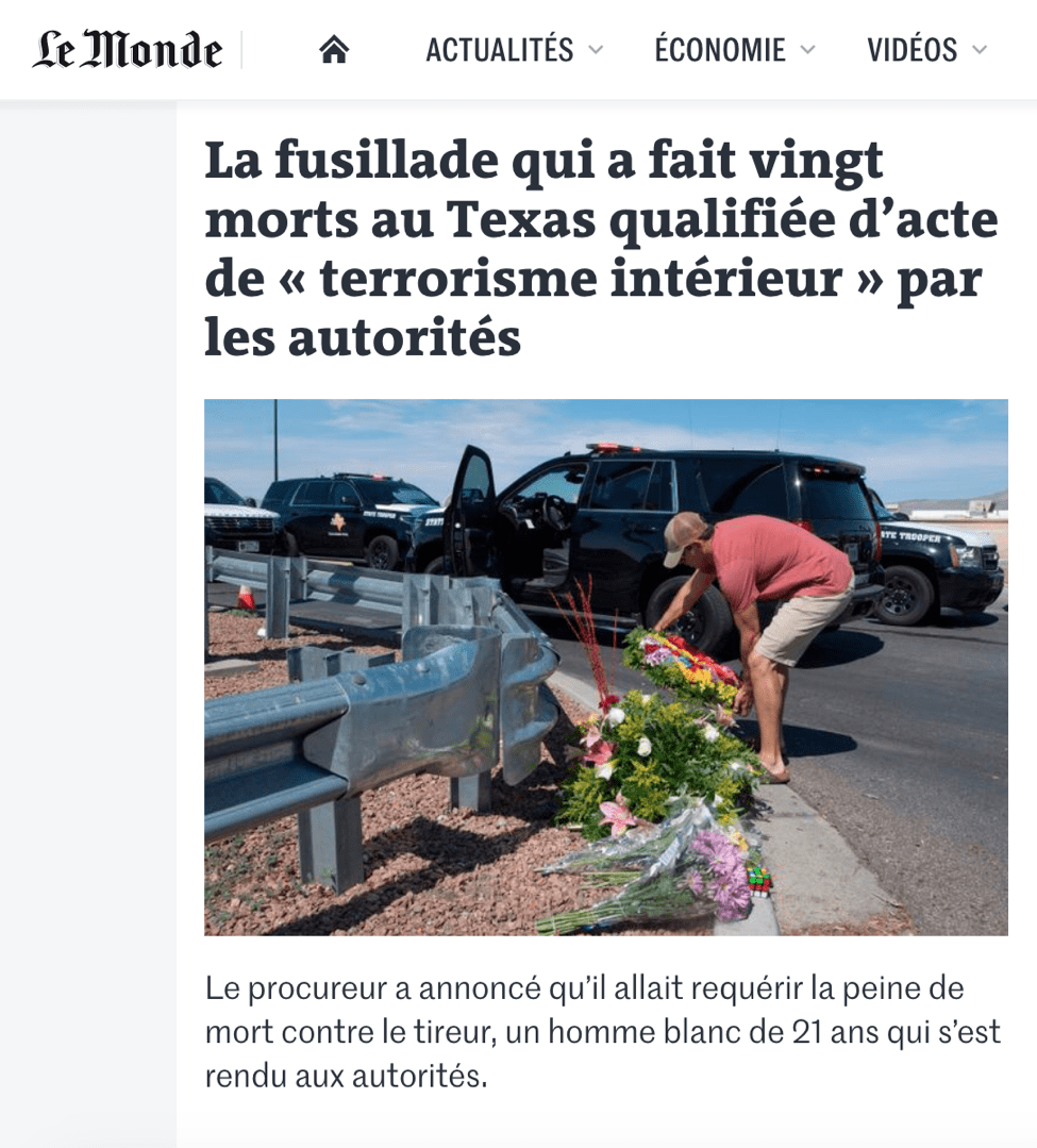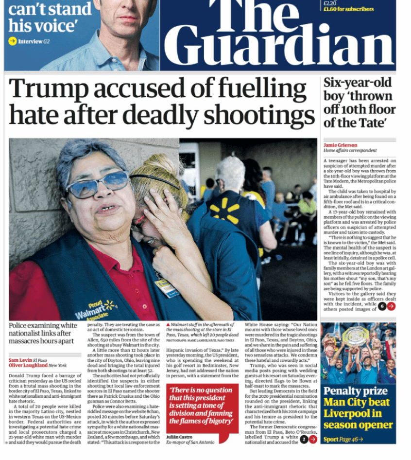 Two landing pages, from the U.K. edition of The Guardian and from France’s Le Monde, following the shootings in El Paso and Dayton, Ohio over the weekend. / Images via screen shot.