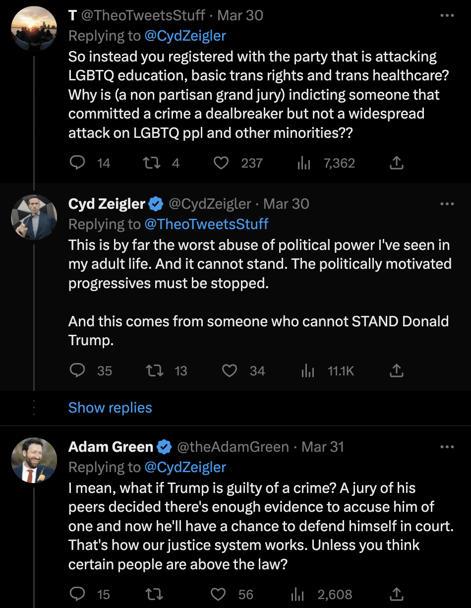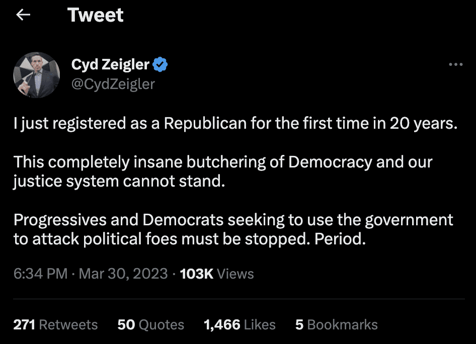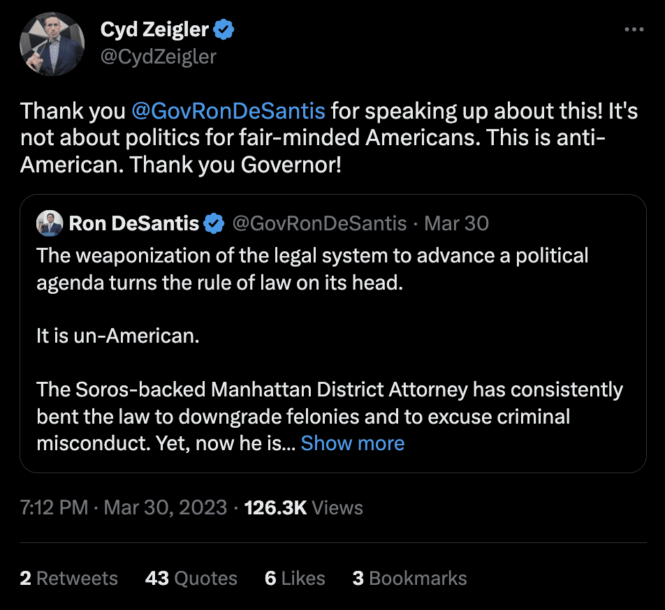 So Zeigler took to Twitter to show support for Ron DeSantis because DeSantis spoke up against the use of the judicial system to advance a political agenda. Does that mean Zeigler is okay with DeSantis pushing forth “Don’t Say Gay” bills and raping the educational system in Florida of any “woke” ideals?
