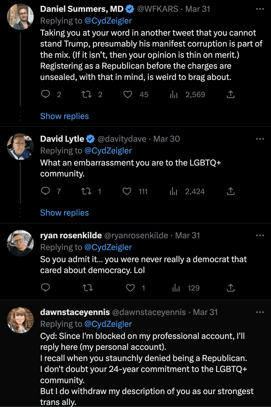 There are many calling out Zeigler on his Democratic past as if it was just a label and not a true party affiliation. Was he a Republican in disguise? There are mixed messages from people that apparently know him better or follow him on the socials.