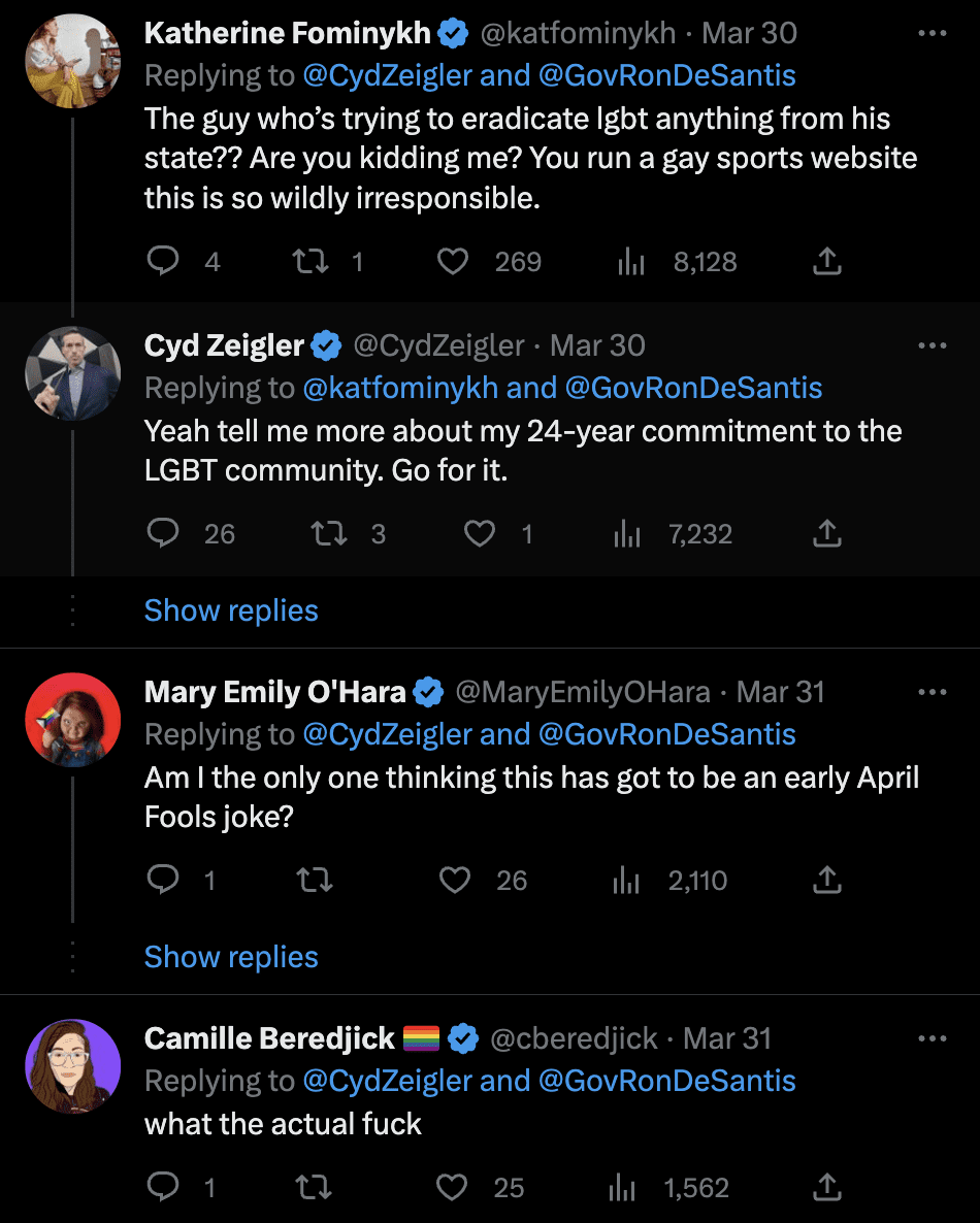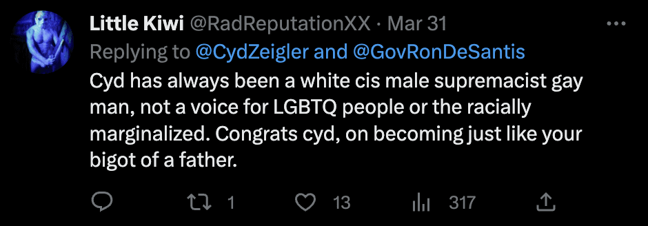 I really appreciated your bold stance in standing up against those who hurt the LGBTQ+ community. Your article about Cyd Zeigler Jr.’s recent tweets got me thinking, do you think it’s okay for LGBTQ+ individuals to support politicians with anti-LGBTQ+ agendas like Governor DeSantis, or do you think it goes against the community’s interests? Thank you for sharing your insights.