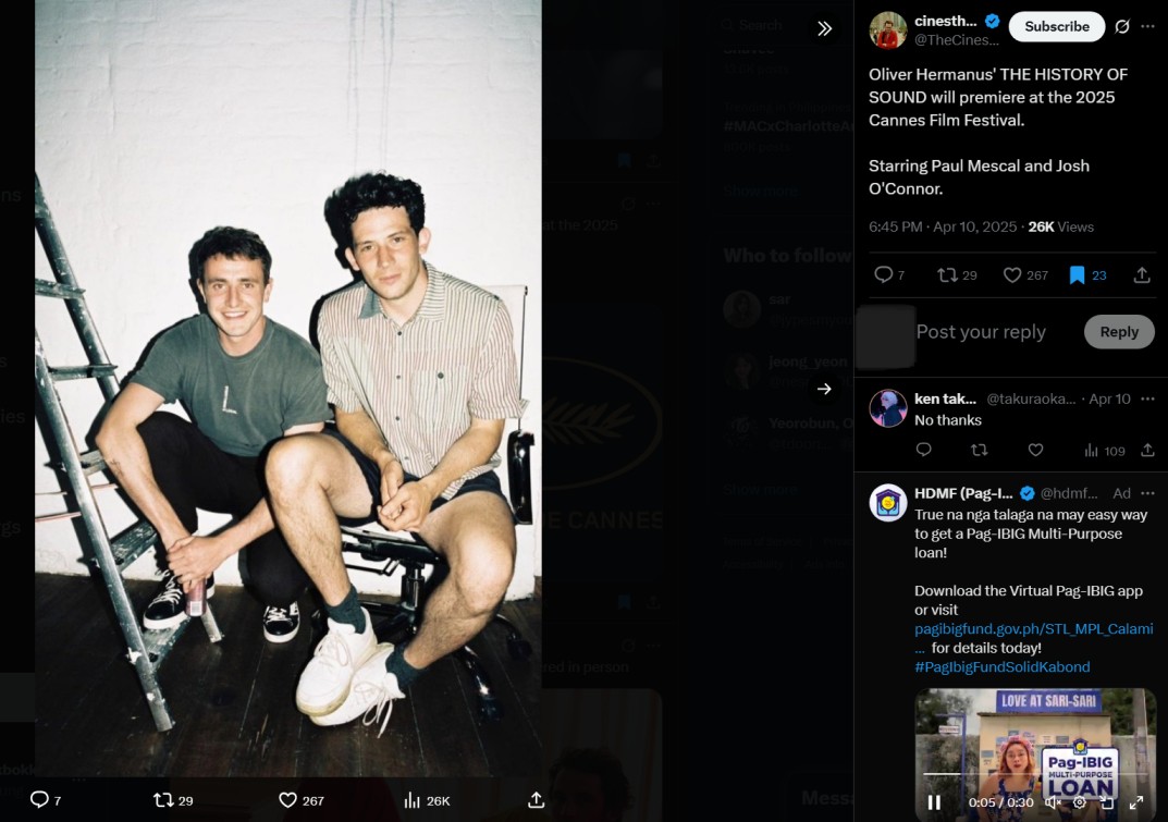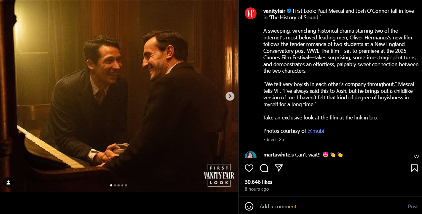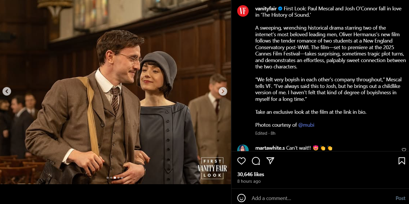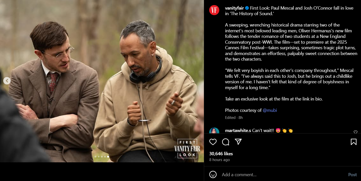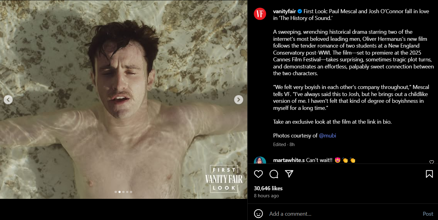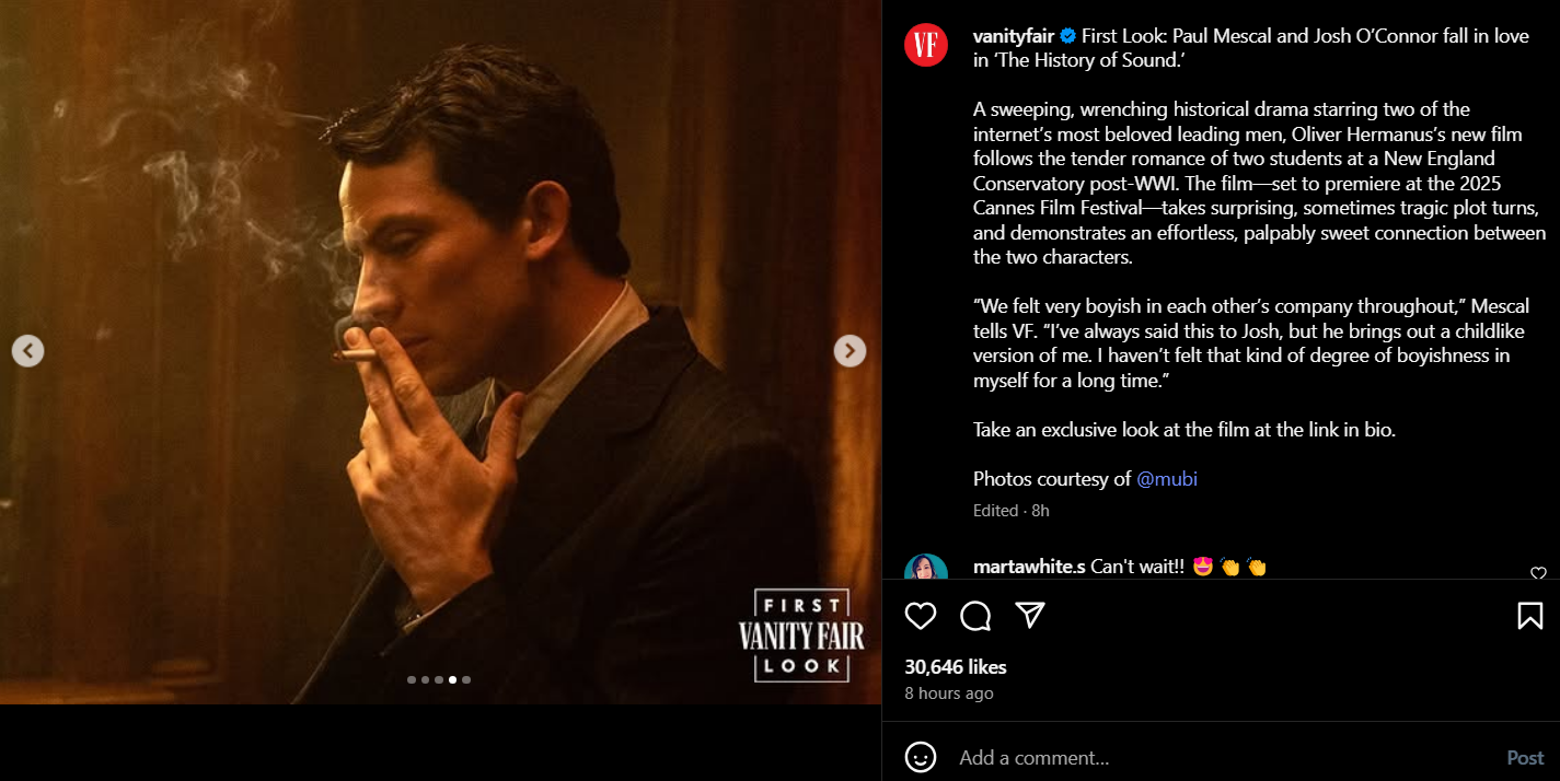 Directed by Oliver Hermanus and premiering at Cannes, The History of Sound is not just another period piece—it’s a queer love story wrapped in a folk song, soaked in memory, and stitched together with longing. Imagine Call Me by Your Name if Elio had a voice degree and more emotional follow-through. Mescal and co-star Josh O’Connor (a man so charming he made tennis look like a religious experience in Challengers) play Lionel and David—two young men swept up in each other’s orbit during WWI-era New England.