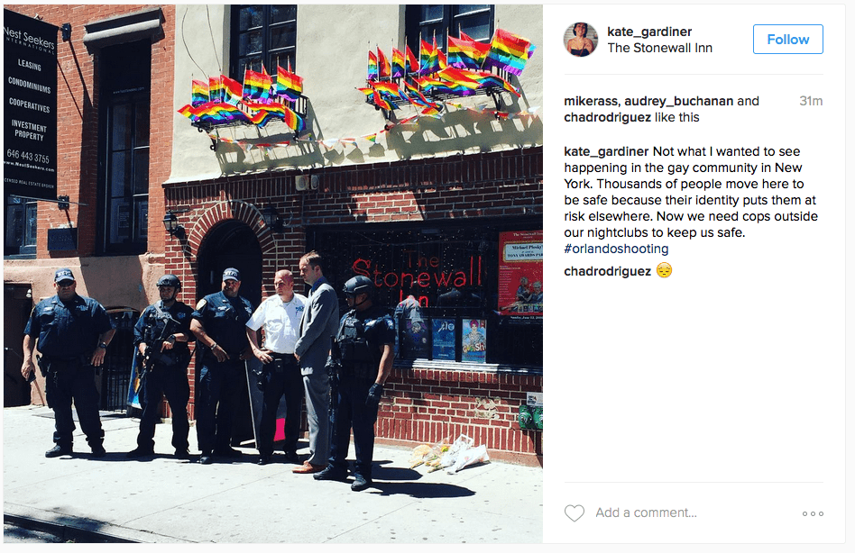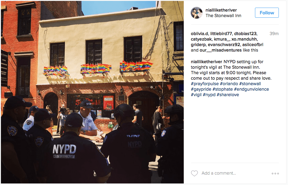 A police force is gathering in front of Stonewall in NYC and we appreciate it. Police are gathering ahead of the crowds that will attend a vigil tonight for Orlando.