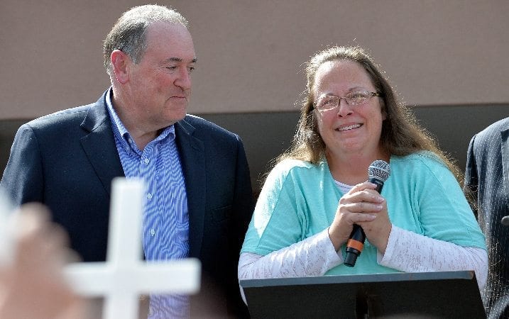 Davis is, of course, the Kentucky clerk who cited her Christian faith in refusing to sign same-sex marriage certificates. She spent six days in a Kentucky jail for refusing to to her job. Then Sarah Huckabee Sanders’s dad held a pep rally for her.