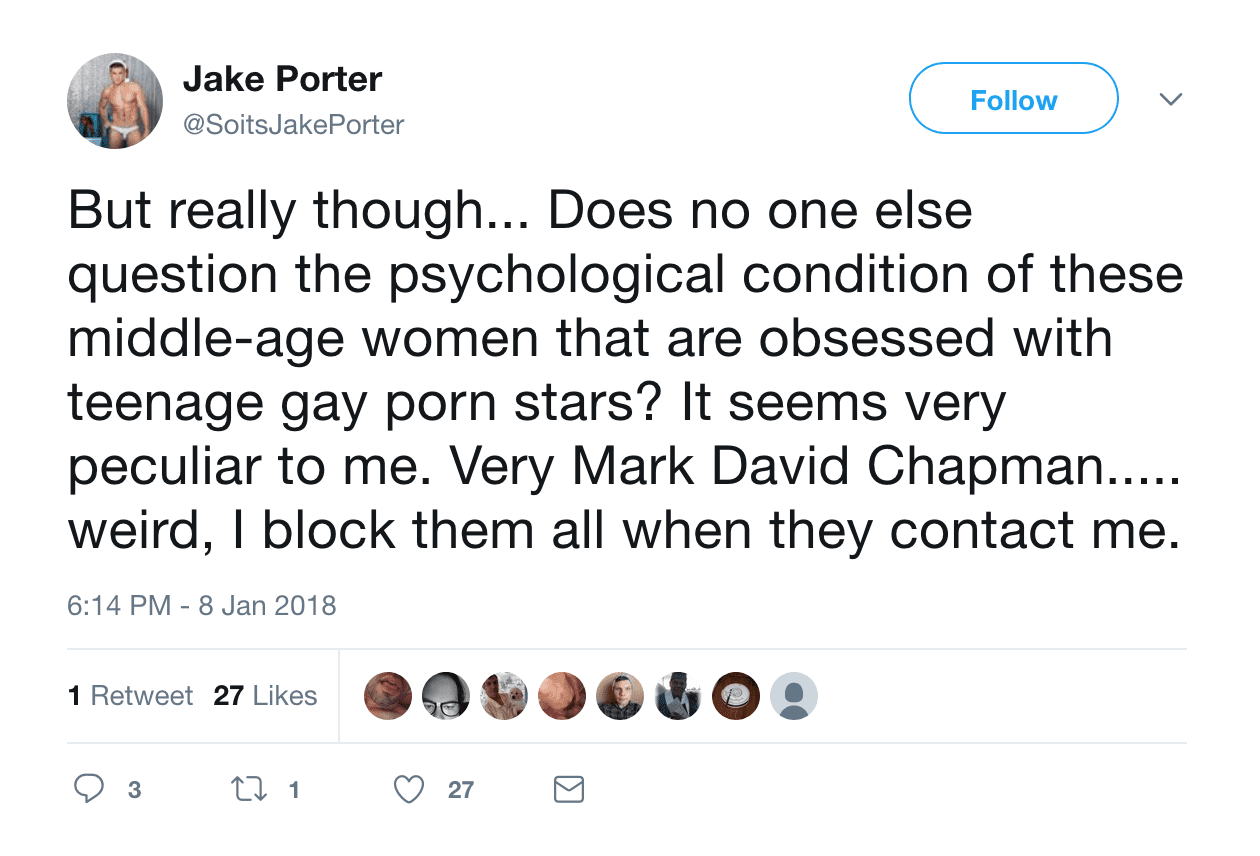 In what looks like a now deleted tweet or two, Jacob mocks middle-aged women who love gay porn stars, calling them "obsessive" and "borderline unstable." Not only that, but he compares them to Mark David Chapman, the dude who killed John Lennon in the early 80's.