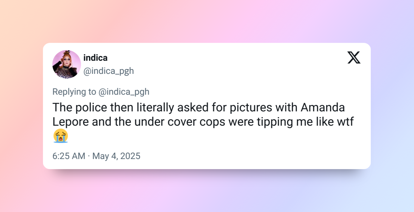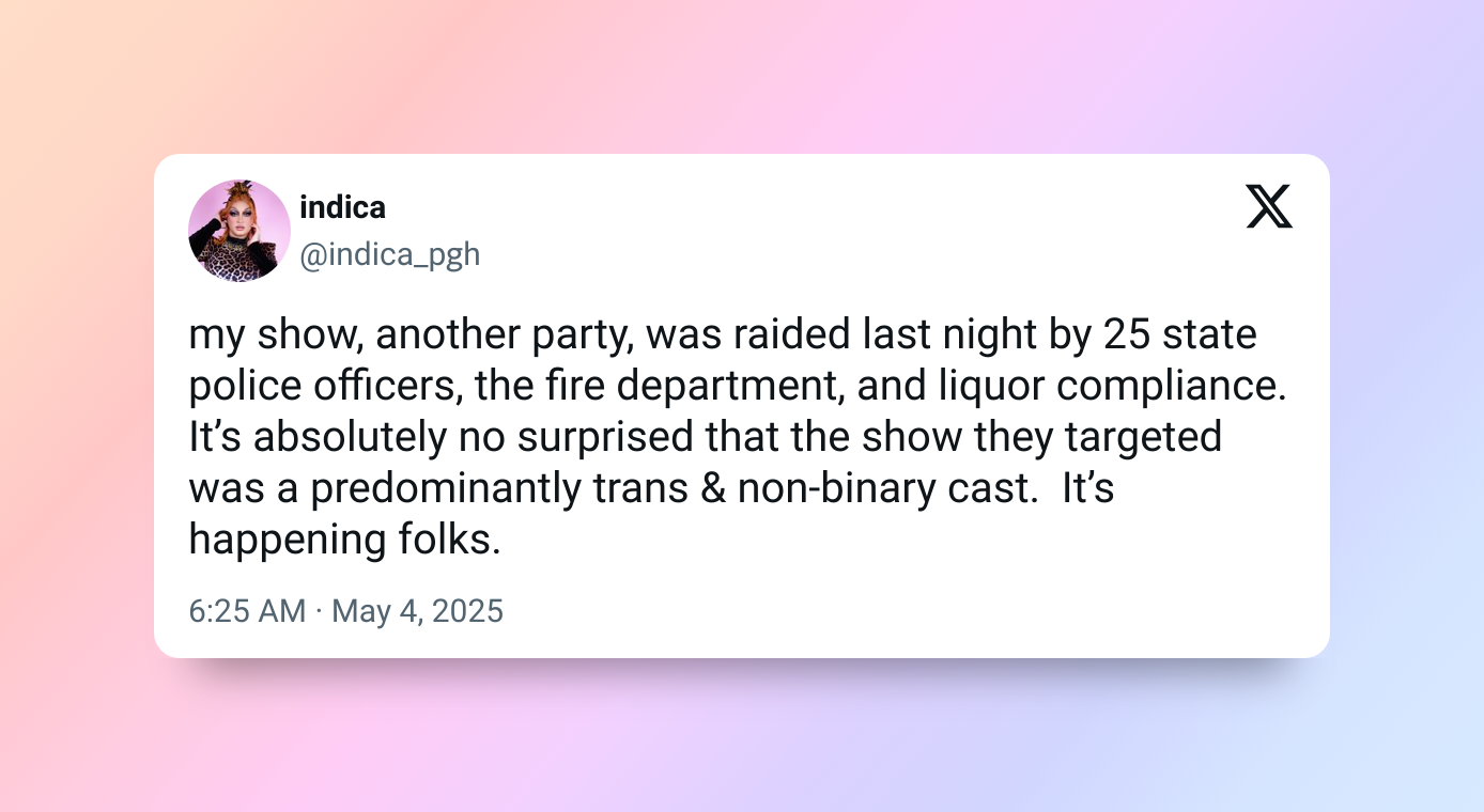 Per reporting from QBurgh, drag artist Indica was on stage alongside trans icon and nightlife living legend Amanda Lepore when the officers began assembling in the shadows of the venue. The performance continued undeterred—because what is drag if not the art of carrying on, lashes long and spirit longer?