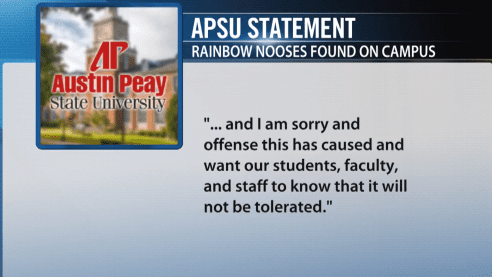 It is unclear who was responsible for hanging 6 nooses up on the Austin Peay State University campus in Clarksville, Tennessee, but the outrage was immediate. Local NewsChannel 5 was quick to cover the breaking story and authorities were called in, even the F.B.I. Here is the channel's broadcast.