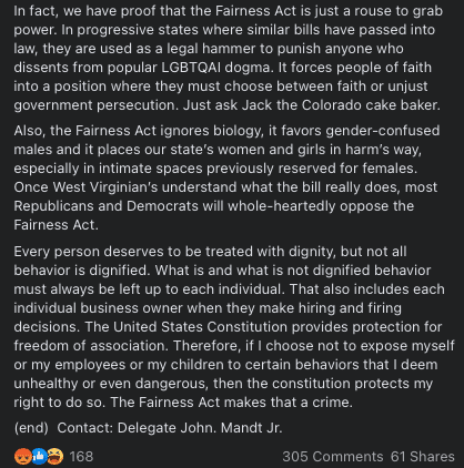 “Del. John Mandt continues to brazenly lie about the Fairness Act and LGBTQ people.