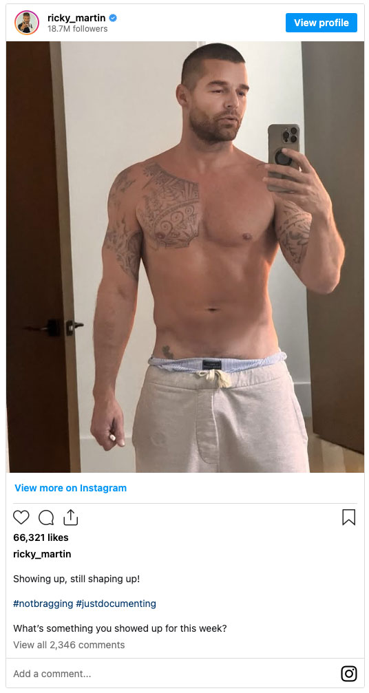Sharing some favorite InstaSnaps from the week, beginning with Ricky Martin ‘showing up, shaping up’ as a lean, mean selfie machine.