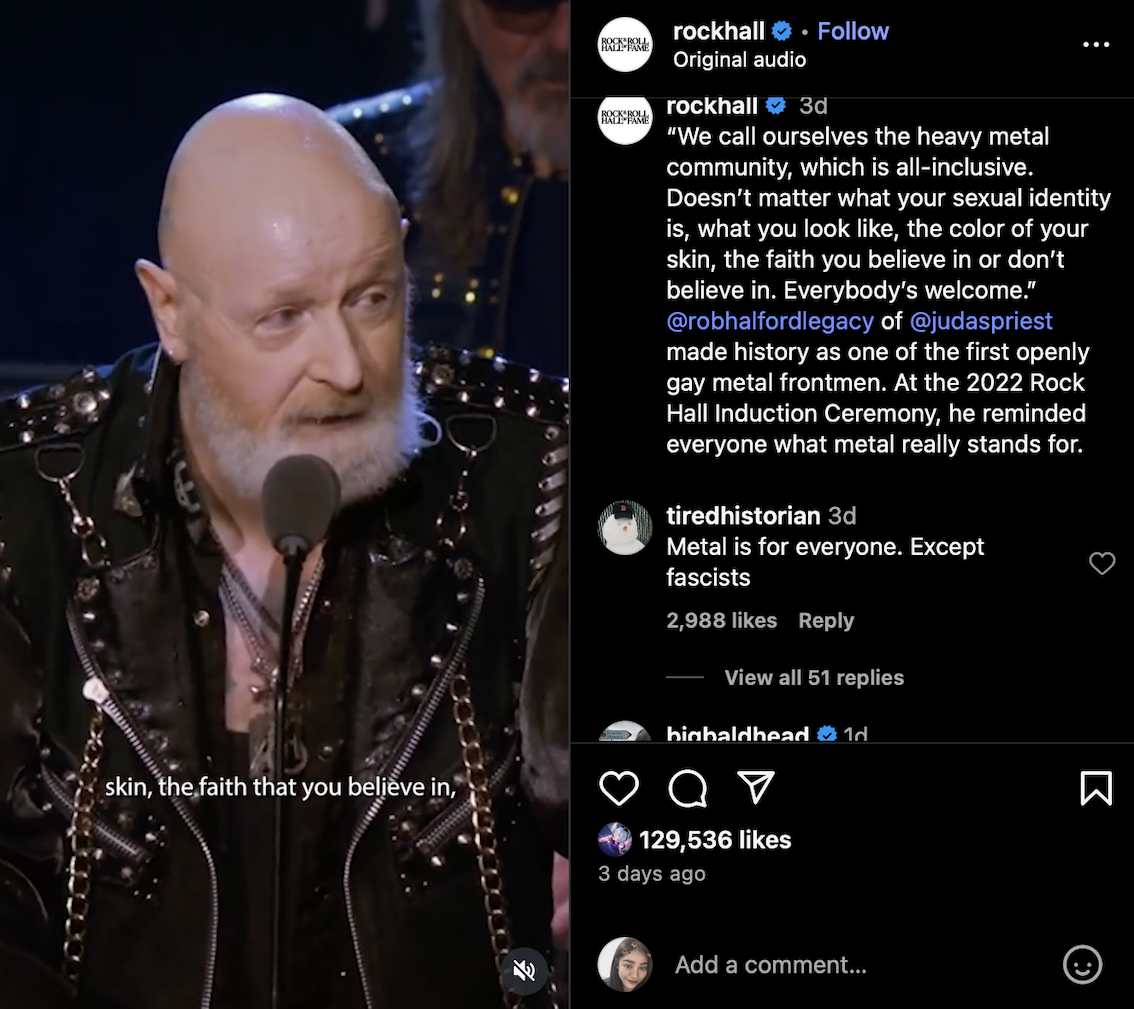 “I’m the gay guy in the band,” he declared. “We call ourselves the heavy metal community which is all-inclusive, no matter what your sexual identity is, what you look like, or what you believe in or don’t believe in. Everybody’s welcome.”