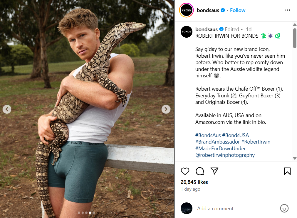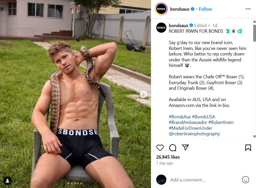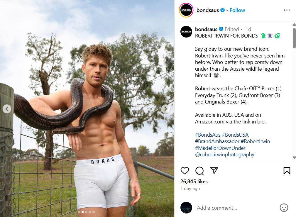 Robert Irwin, the 21-year-old conservationist and son of the late Steve Irwin, has recently stripped down for the iconic Australian underwear brand, Bonds. The campaign, which has already garnered attention, features Irwin in his skivvies (along with some rather bold wildlife companions, like snakes and spiders), a departure from his usual khaki-filled wardrobe.