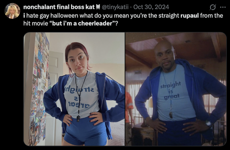 So, whether you first watched it on a scratched-up DVD or streamed it recently after someone screamed “You haven’t seen But I’m a Cheerleader!?”—Ru’s legacy in the film is undeniable. And if you’re still looking for this year’s Halloween costume, might we suggest a certain bright orange shirt and a smirk? Ru would approve.