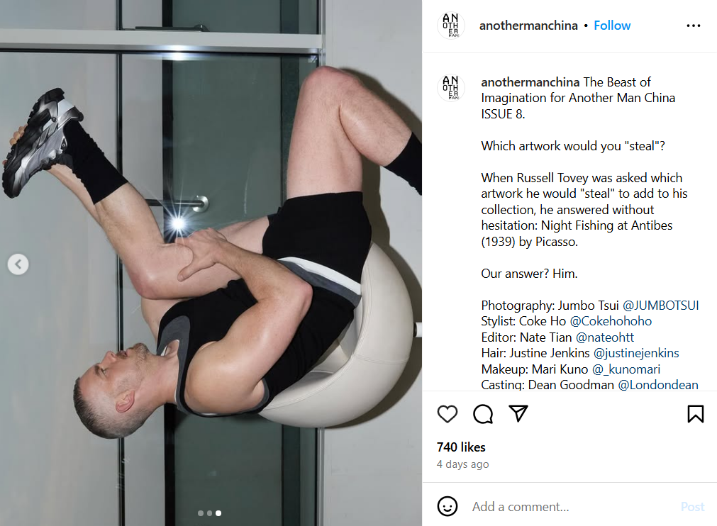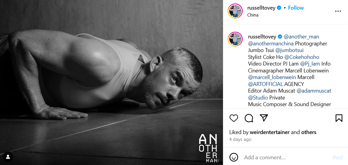 Then there’s the gymwear shot: Tovey in sculpted black, grey, and white gear, caught mid-stretch like your hottest fantasy of that one guy at Barry’s Bootcamp who never makes eye contact but definitely knows what he’s doing. The man is limber. And if that weren’t enough, we get a black-and-white image of Tovey displaying his push-up prowess—because apparently the world needed further proof that Russell Tovey contains multitudes, all of them jacked.