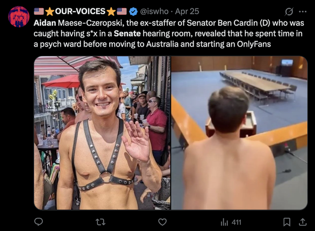 Aidan Maese-Czeropski has lived more lives at 25 than most of us will in a lifetime. The former Democratic U.S. Senate staffer made headlines in 2023 when an explicit gay sex tape featuring him—filmed inside the Hart Senate Office Building—leaked publicly.