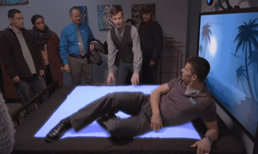 Unfortunately for Nelson, the experience turns into show and tell for the entire store when a computerized bed asks questions about his sleeping and sex habits. While making reference to his Manhunt profile, sexual position preference, and body style, the computer narrows down the list of best bed choices for Nelson and his partner.