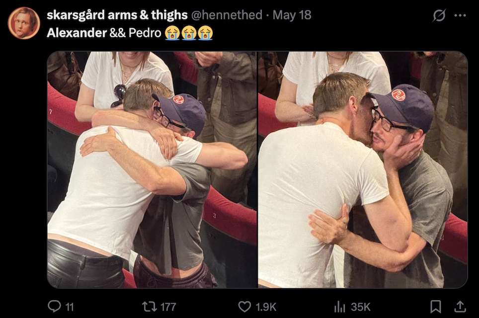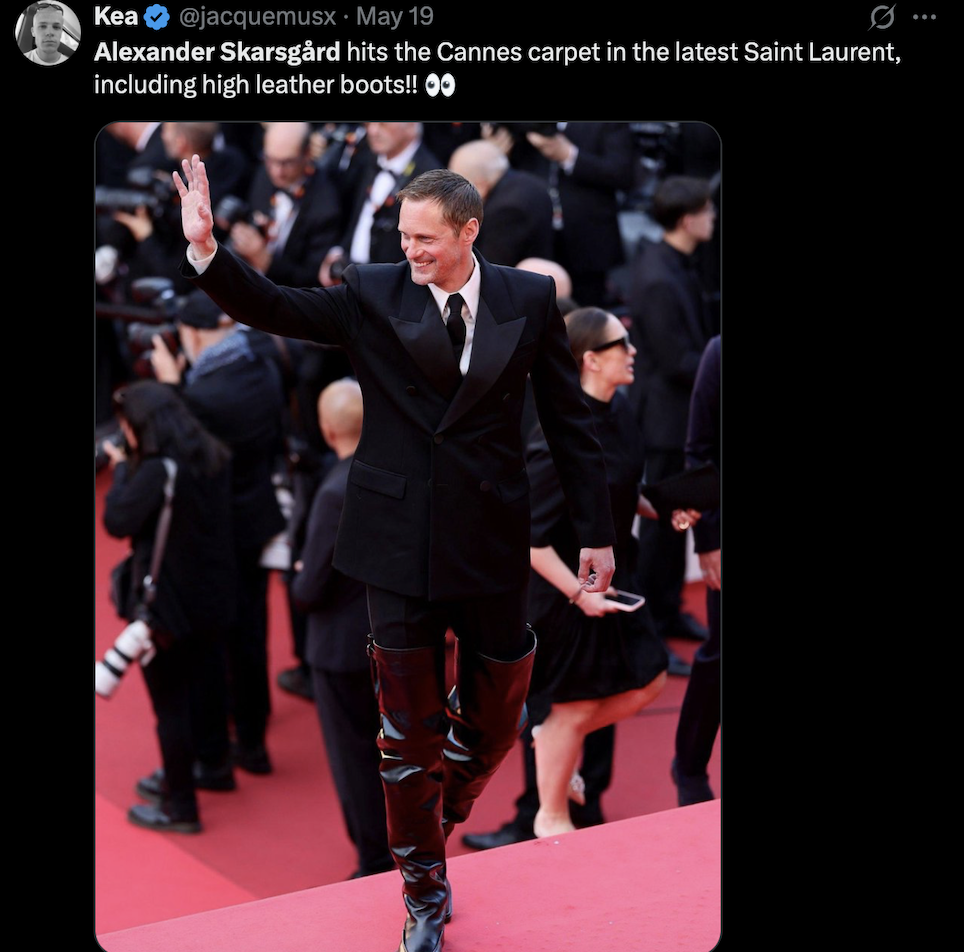 But the real cherry on top? After the screening, Skarsgård gave the Cannes attendees a show and planted a kiss on the cheek of our favorite internet daddy–Pedro Pascal. Just two men, some thigh-high leather boots, and an international film festival. The girls (and the gays) were in shambles.
