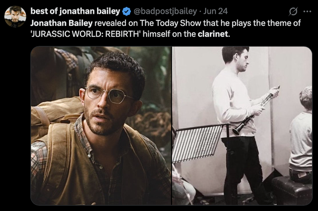 Jonathan Bailey on playing the clarinet for his character’s theme on the Jurassic World Rebirth soundtrack pic.twitter.com/kpUaLwoXoM— iRis 🐝 🧲🌷🧵👸🏾🤴🏻 (@iris_bee_) June 27, 2025