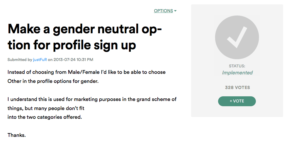 This follows a support request over 3 years ago for adding more gender options, which received over 300 votes. We found that request and blogged about it, appealing to followers to add their votes and comments, and the request was reviewed by Spotify soon after. In the mean time Spotify were willing to remove the gender information from users’ accounts manually.