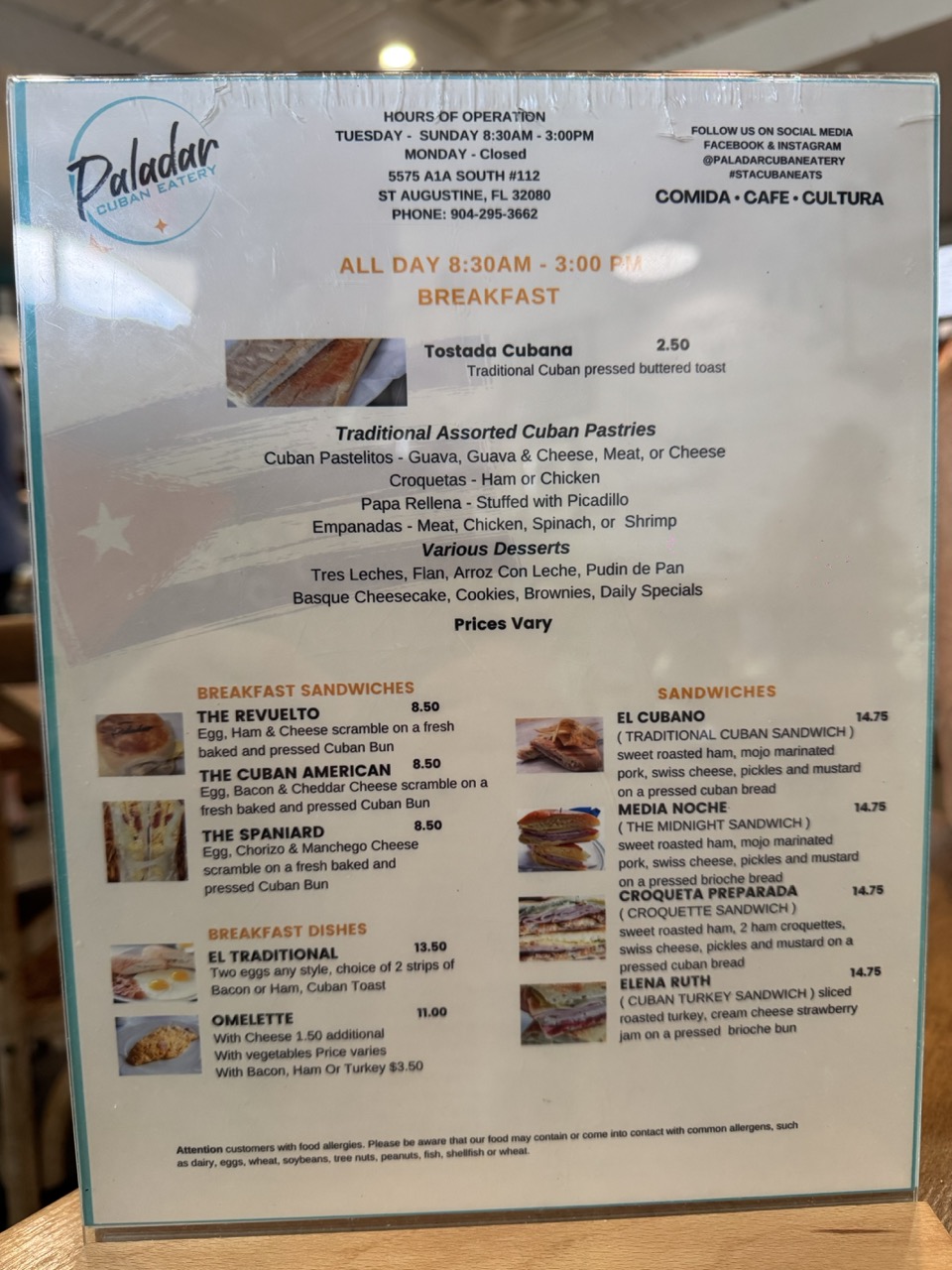 Perfect for quick Cuban pastries, sandwiches, and strong cafecito. The problem is, we did not want to leave this tiny little eatery. The drinks were inventive, the pasteries were true to the culture, and the food was made to our specifications and we had many. The staff was very yummy to look at too. Can I say that?  Yes, I can and did, btu honestly, this is a fun offering that seems family operated. Keep an eye on their website as I think there was rumor of some movement or opening another location closer to town.