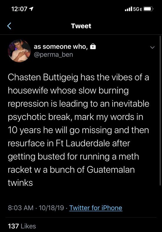 The Sanders staffer also went after Buttigieg’s husband, Chasten, tweeting, “Chasten Buttigieg has the vibes of a housewife whose slow burning repression is leading to an inevitable psychotic break, mark my words in 10 years he will go missing and then resurface in Ft Lauderdale after getting busted for running a meth racket w a bunch of Guatemalan twinks.”