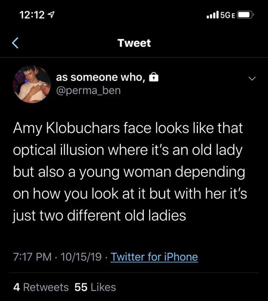 He mocked Sen. Amy Klobuchar (D-MN) comparing her face to “that optical illusion where it’s an old lady but also a young woman depending on how you look at it but with her it’s just two different old ladies.” Mora also said Klobuchar “looks like her name: pained, chunky, [and] confused origin/purpose.”