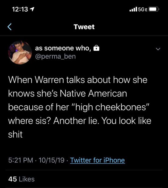 Mora dragged Sen. Elizabeth Warren (D-MA) writing, “When [Sen. Elizabeth] Warren talks about how she knows she’s Native American because of her ‘high cheekbones’ where sis? Another lie. You look like shit.” He also accused her of being “an adult diaper fetishist.”