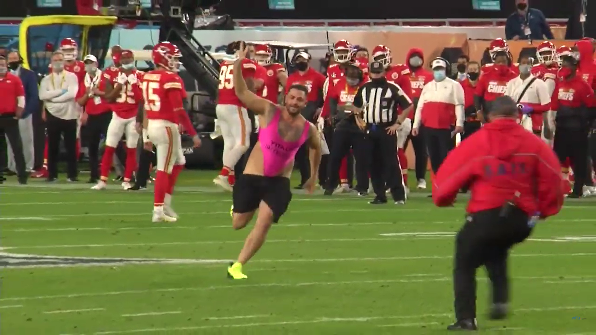 31-year-old Yuri Andrade, a Boca Raton native, is the streaker in question. Andrade has been charged with misdemeanor trespassing after he ran across Raymond James Stadium in Tampa, Florida while wearing a pink leotard, black shorts, and neon yellow shoes. Andrade made his way across the field during the fourth quarter of the Buccaneers v. Chiefs game. He even attempted to lower his shorts before quickly being chased down. Though if you ask anyone who watched the game, the streaking was a welcome break from the Buccaneers’ landslide win (31-9).